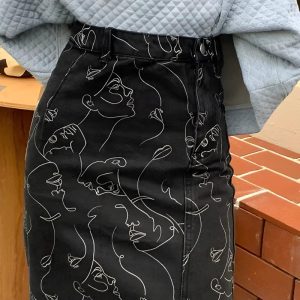 Abstract Faces Denim Midi Skirt