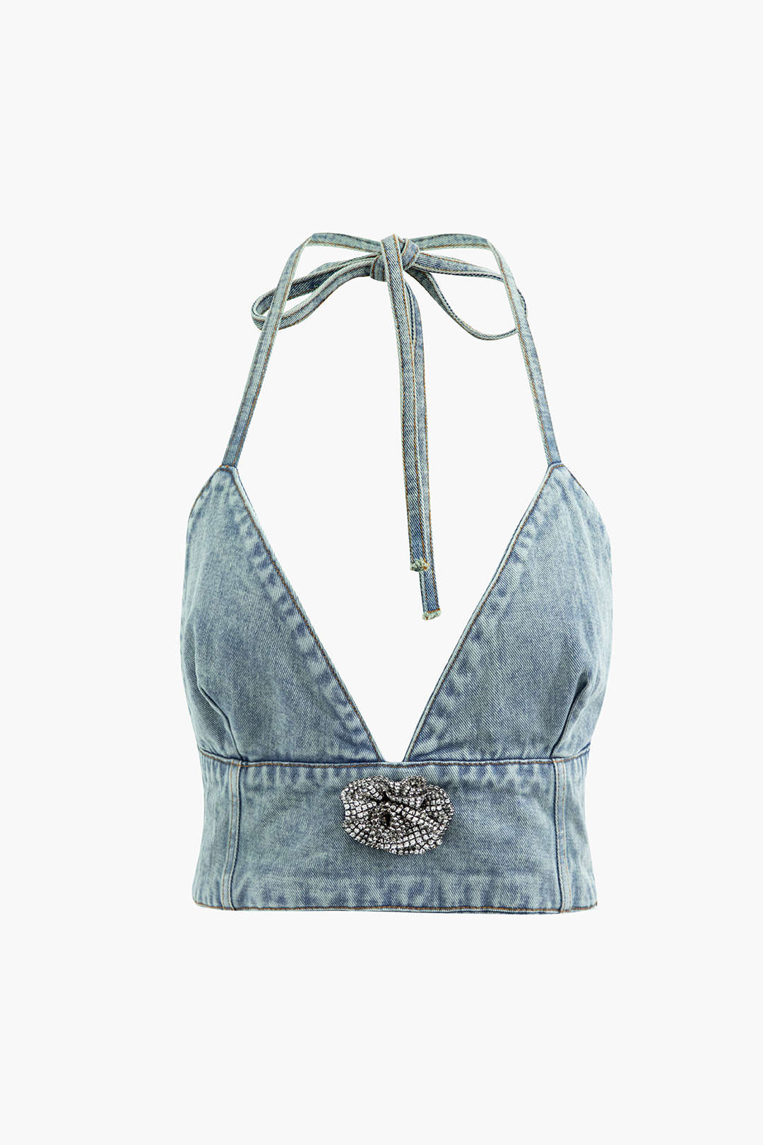 3D Rhinone Flower V- Neck Halter Top Y2K Denim Cute Top Outfits High-quality product featuring prom dresses, spring outfits, business casual outfits and more. Modern design that fits the latest trends. Premium materials ensure durability and comfort. Order now for special offers! Product designed with attention to every detail. Suitable for all occasions and personal styles.