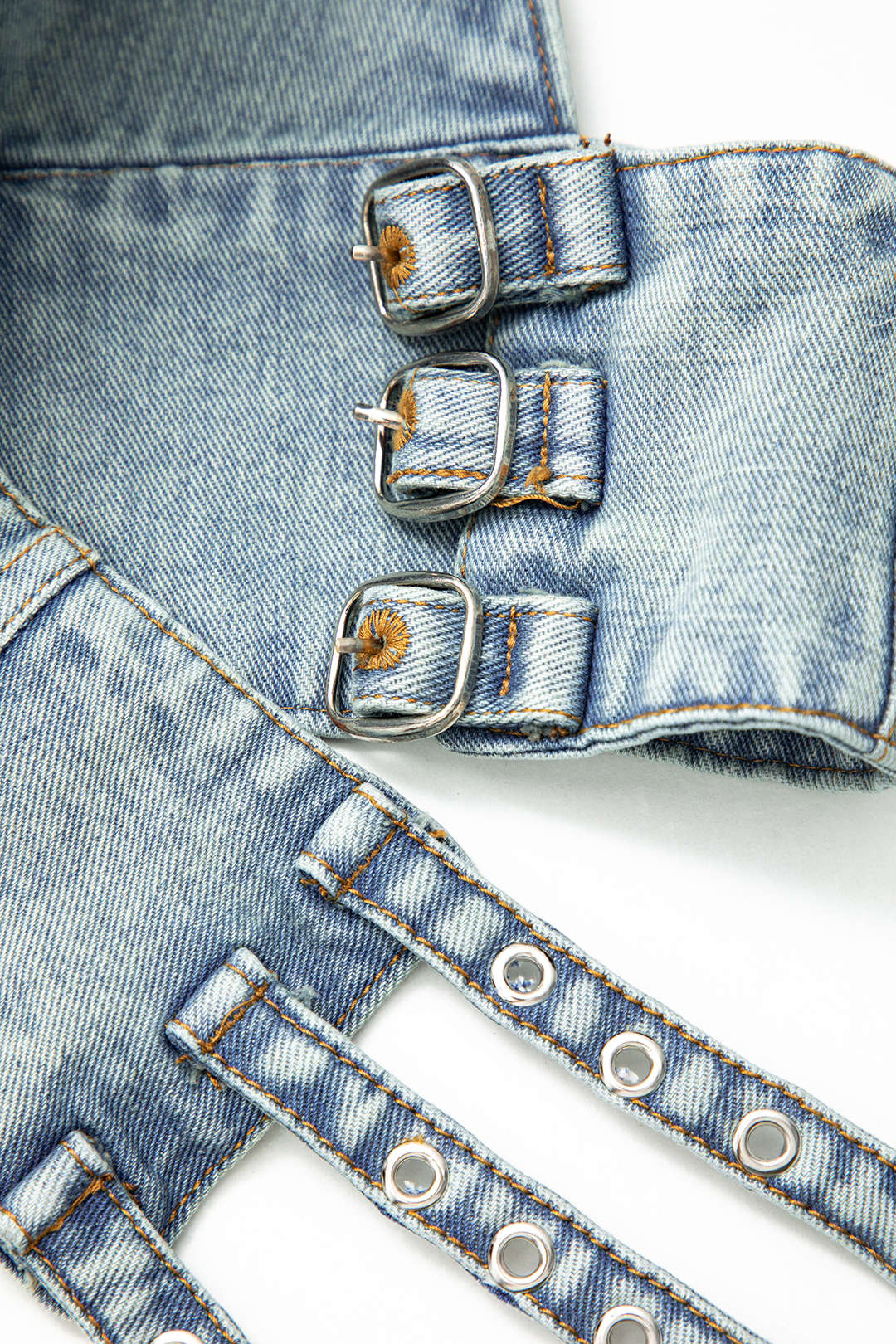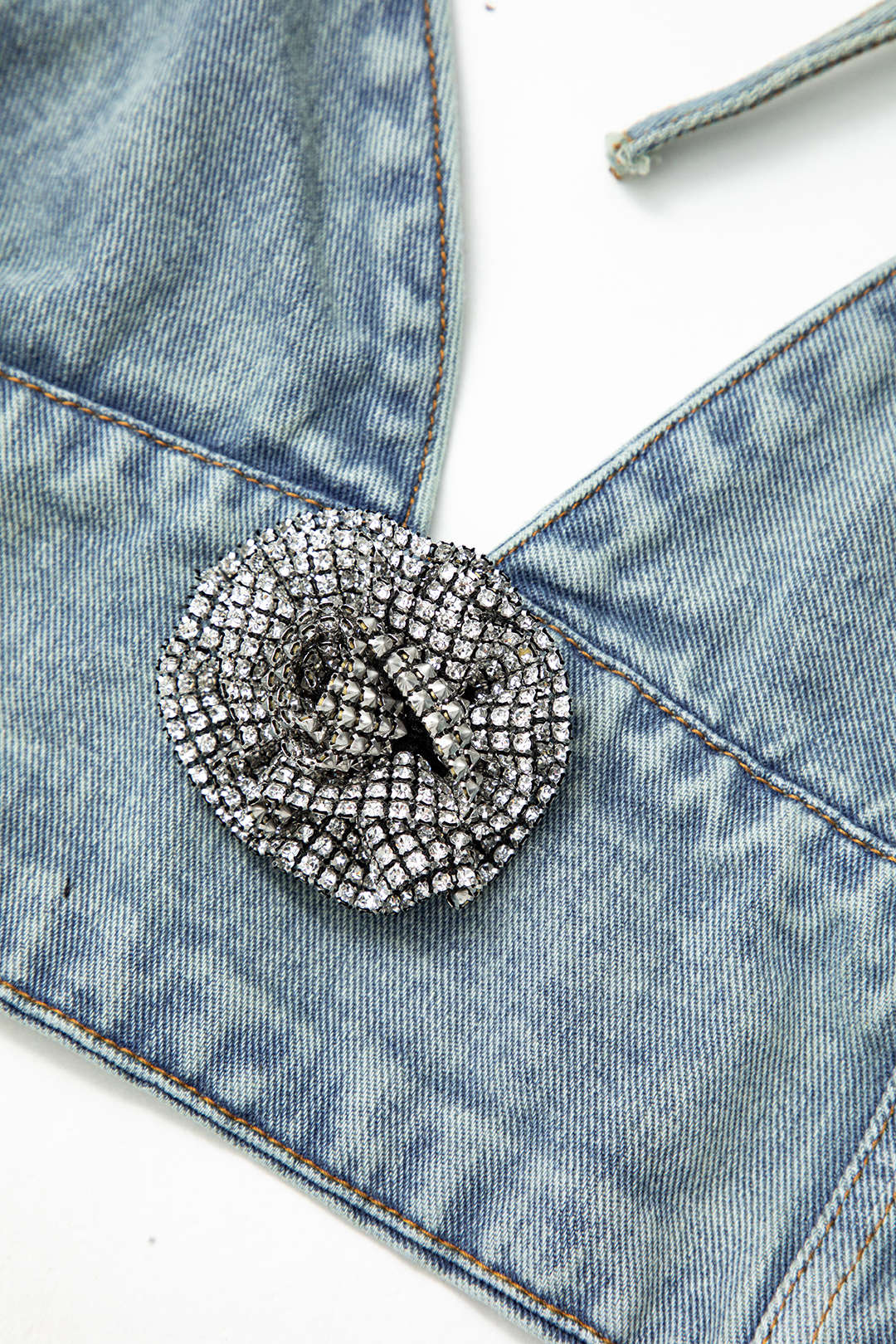 Ready to make a statement? Shop now and transform your summer style with our Y2K Rhinestone Flower Denim V-Neck Halter Top!