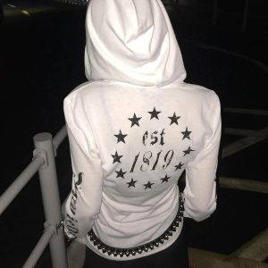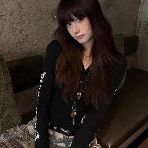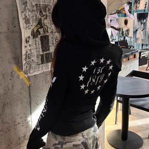 Acubi-style hooded top with star and gothic text graphics. Slim fit, lightweight feel, and edgy vibes make it a statement piece for layered street looks.