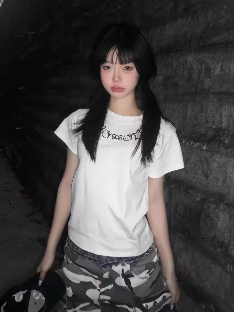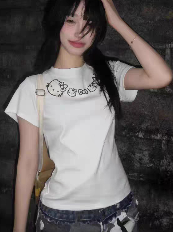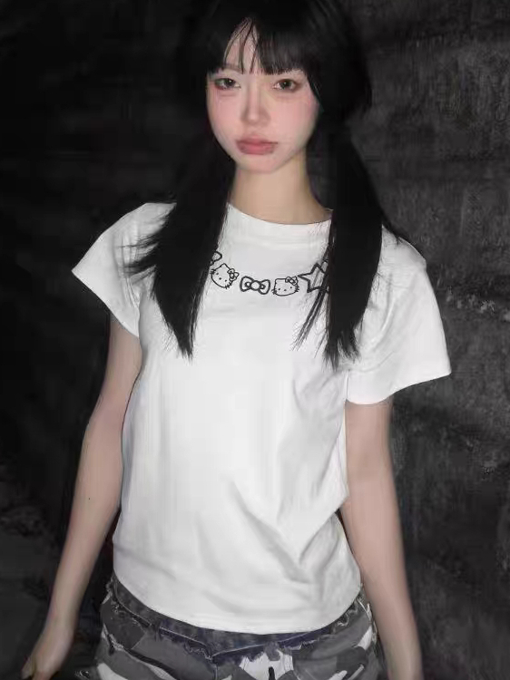 Retro Kitty Cat Print White Short Sleeve T- shirt Women Summer Slim Fit Top, Y2K High-quality product featuring prom dresses, spring outfits, business casual outfits and more. Modern design that fits the latest trends. Premium materials ensure durability and comfort. Order now for special offers! Product designed with attention to every detail. Suitable for all occasions and personal styles.