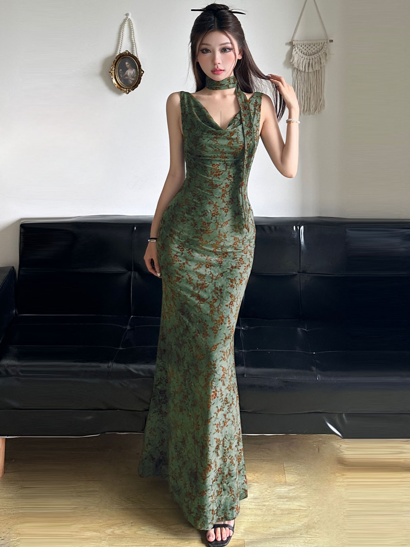 Charm Green Pine Fish Tail Long Dress Women Flowing Collar, Body Hugging High-quality product featuring prom dresses, spring outfits, business casual outfits and more. Modern design that fits the latest trends. Premium materials ensure durability and comfort. Order now for special offers! Product designed with attention to every detail. Suitable for all occasions and personal styles.