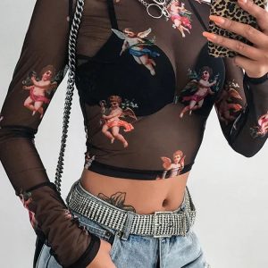 Heavenly, but make it hot. This sheer mesh long sleeve top is printed with Renaissance-style cherubs, giving sweet-meets-spicy vibes. With a figure-hugging fit and high neckline, it’s the ultimate piece for layering over your fave bralette or under strappy dresses.