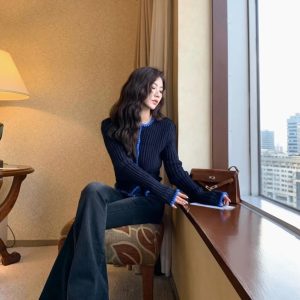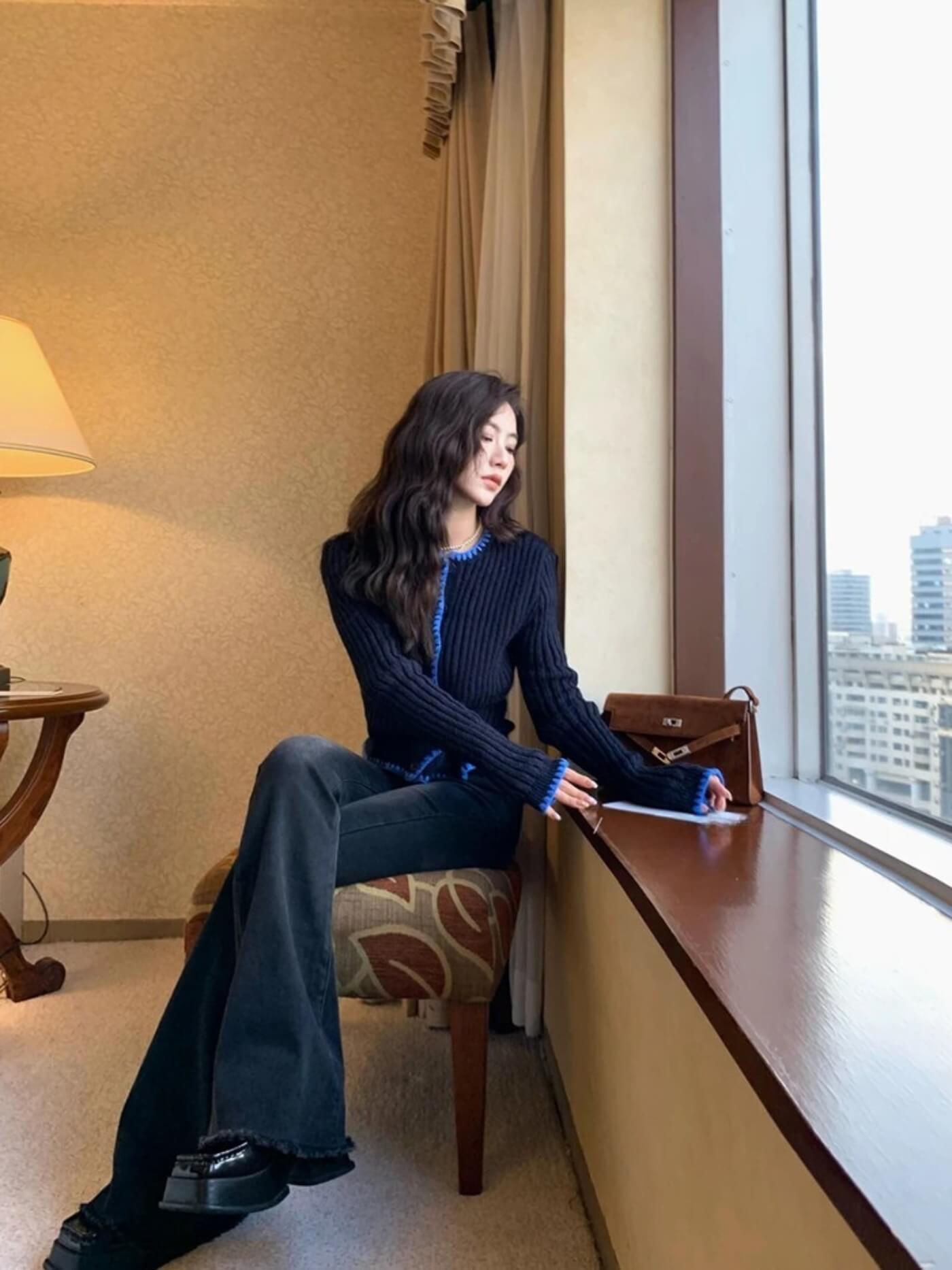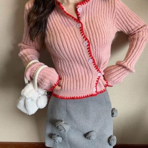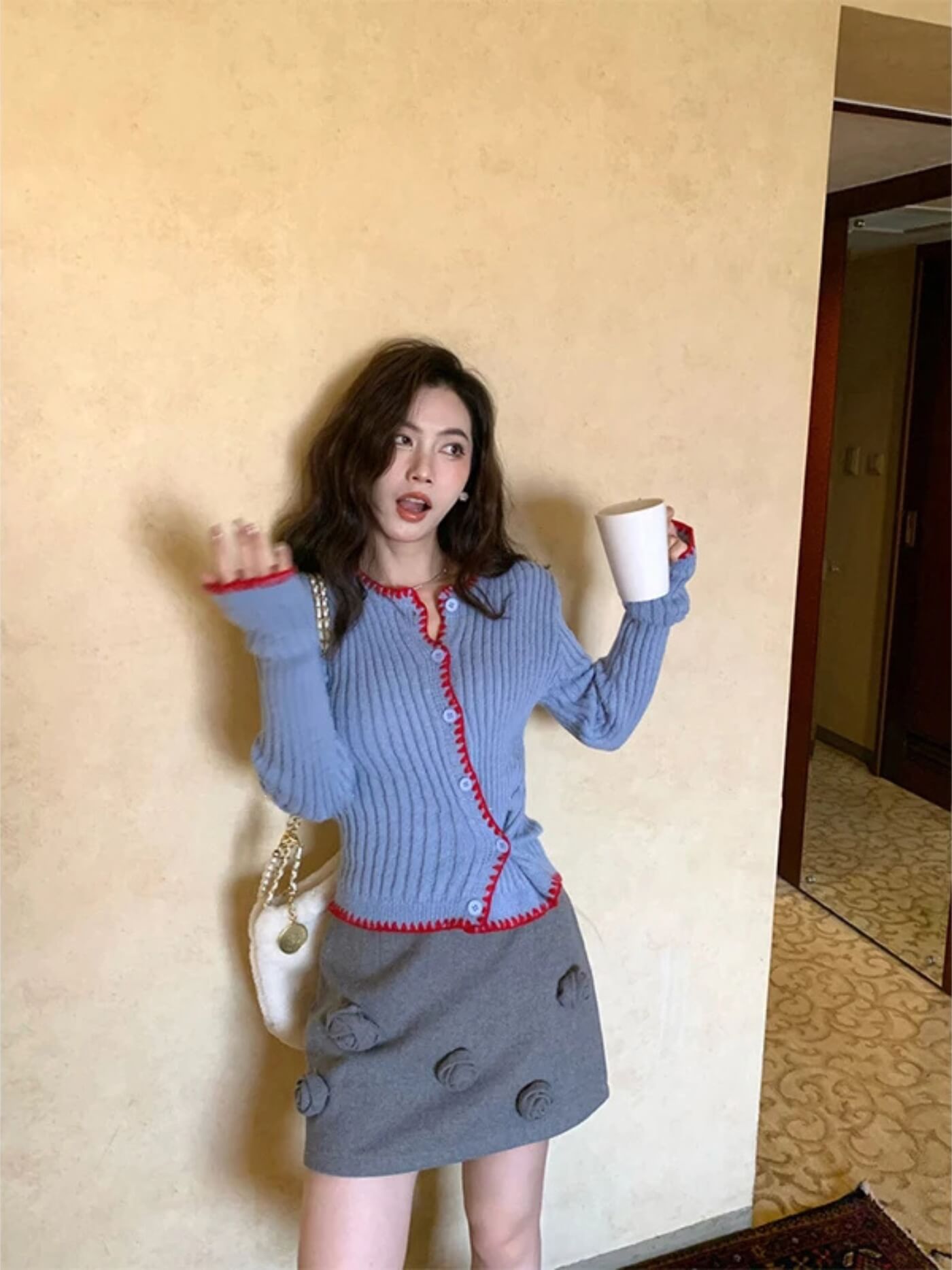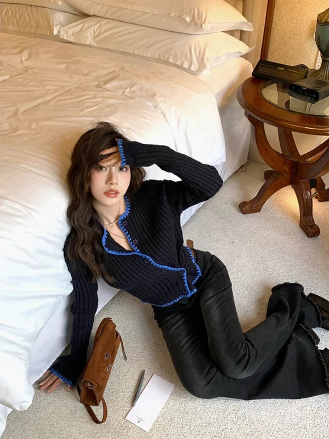 Asymmetric Contrast Trim Knit Cardigan is designed with a fitted silhouette and an uneven front closure that creates subtle structure. The contrast trim outlines the neckline and placket, adding definition without extra bulk. Made from stretch knit fabric, it allows flexibility and maintains shape. Long sleeves and ribbed edges provide balanced coverage and help retain structure during wear.