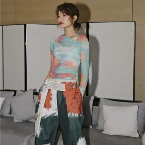 Make a statement in this ultra-sheer mesh top bursting with vibrant tie-dye swirls. With its edgy asymmetric neckline and second-skin fit, this piece brings bold energy to any outfit. Style it solo or layered for that modern Y2K meets streetwear vibe.
