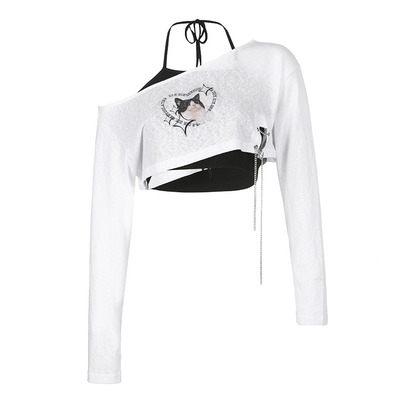 Shoulder Cat Print T- Shirt, Black Halter Neck Tank Top Laye – Outfit Ideas