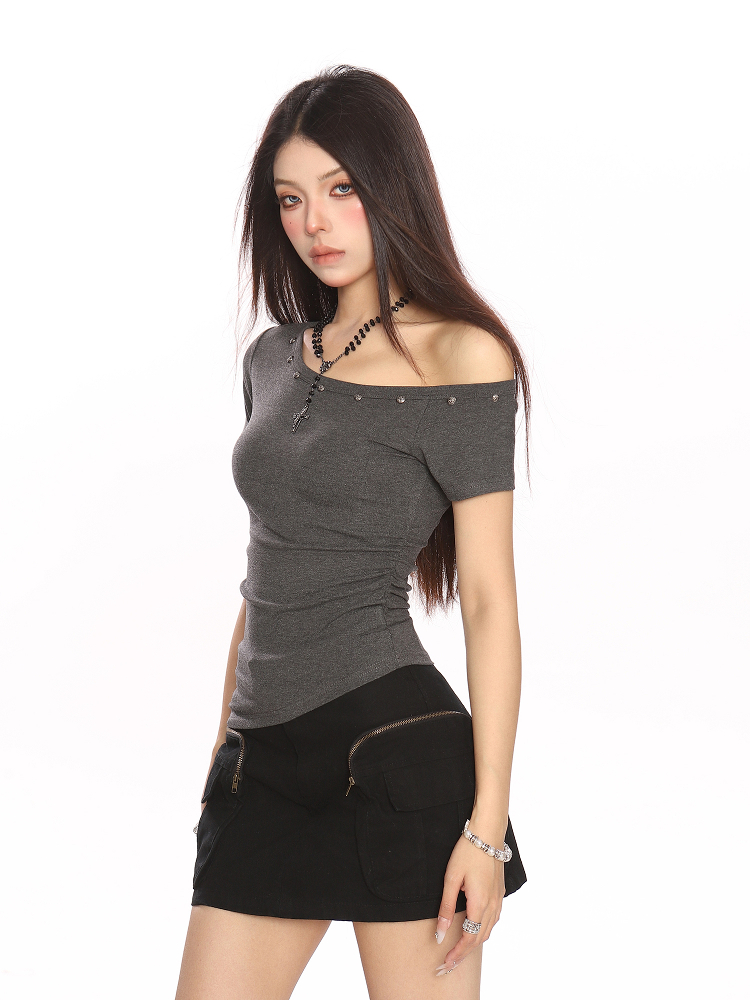Shoulder Studded Short Sleeve T- shirt Women Slim Fit Off Shoulder Top Summer High-quality product featuring prom dresses, spring outfits, business casual outfits and more. Modern design that fits the latest trends. Premium materials ensure durability and comfort. Order now for special offers! Product designed with attention to every detail. Suitable for all occasions and personal styles.