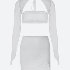 Turn heads with this sleek two-piece set, featuring a crop top with an open back and a high-slit mini skirt. Perfect for a night out, this set combines edgy style with a sophisticated silhouette. The top ties at the back, adding an element of intrigue, while the skirt enhances your curves. Ideal for parties or chic gatherings, this outfit will make you the center of attention.