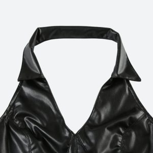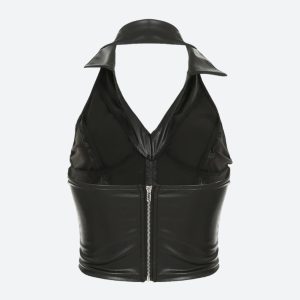 Bring main character energy in this ultra-edgy faux leather crop top. With a halter neckline, pointed collar, and body-sculpting fit, it’s giving 2000s baddie meets club icon. Whether paired with low-rise cargos or a mini skirt, this top is built to slay every night out.
