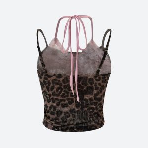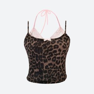 This leopard print crop top perfectly encapsulates the baddie aesthetic. Featuring a pink bra detail and a ribbon accent at the chest, it’s secured with a halter neck tie fastening. Ideal for women seeking a bold, statement piece for festivals, parties, or summertime fun.