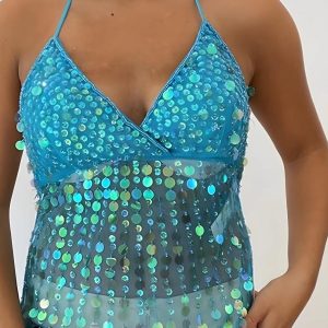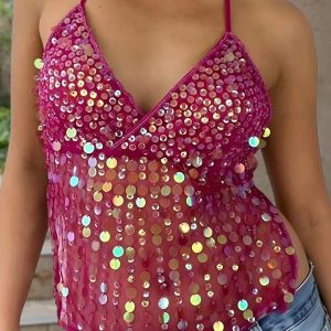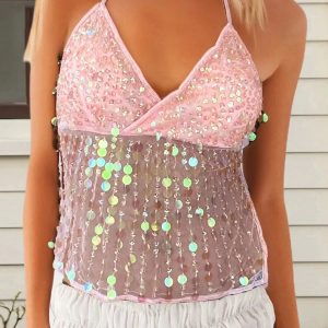 This beaded backless top is crafted in vibrant fuchsia mesh decorated with cascading iridescent beads and sequins. Spotlighted by a plunging V-neckline and thin halter straps that tie at the back, it falls into a loose silhouette with shimmering movement. Ideal for festival looks or evening wear that catches every light.