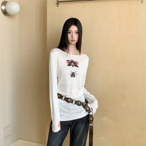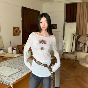 This off-shoulder long-sleeve top brings a dreamy and artistic vibe with its unique beetle and orchid print. The lightweight fabric and relaxed fit make it a versatile choice for layering or wearing solo. Pair it with vintage jeans or a statement belt for an effortless, retro-inspired look.