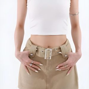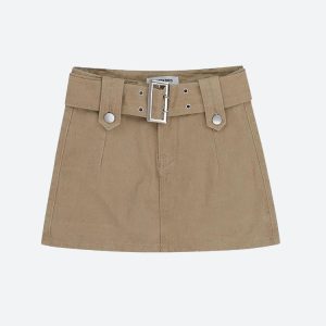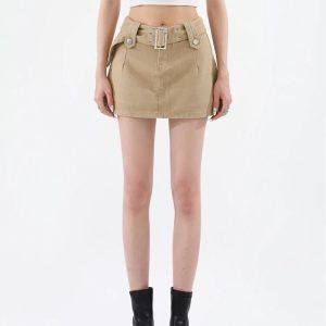 Accentuate your style with this sand-hued, belted denim mini skirt. The sleek silhouette and bold buckle detail infuse a modern twist into a classic design, offering a versatile piece for your fashion-forward wardrobe.