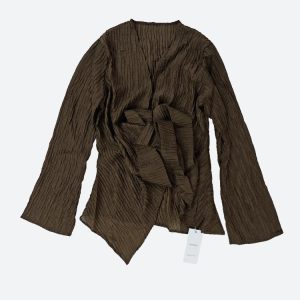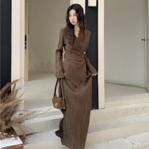 Crafted in luxe pleated fabric, this earthy-toned co-ord drapes effortlessly over the body. The wrap blouse cinches the waist with an asymmetrical hem, while the matching maxi skirt flows with graceful movement. Perfect for slow mornings, gallery strolls, or a soft glam dinner mood.