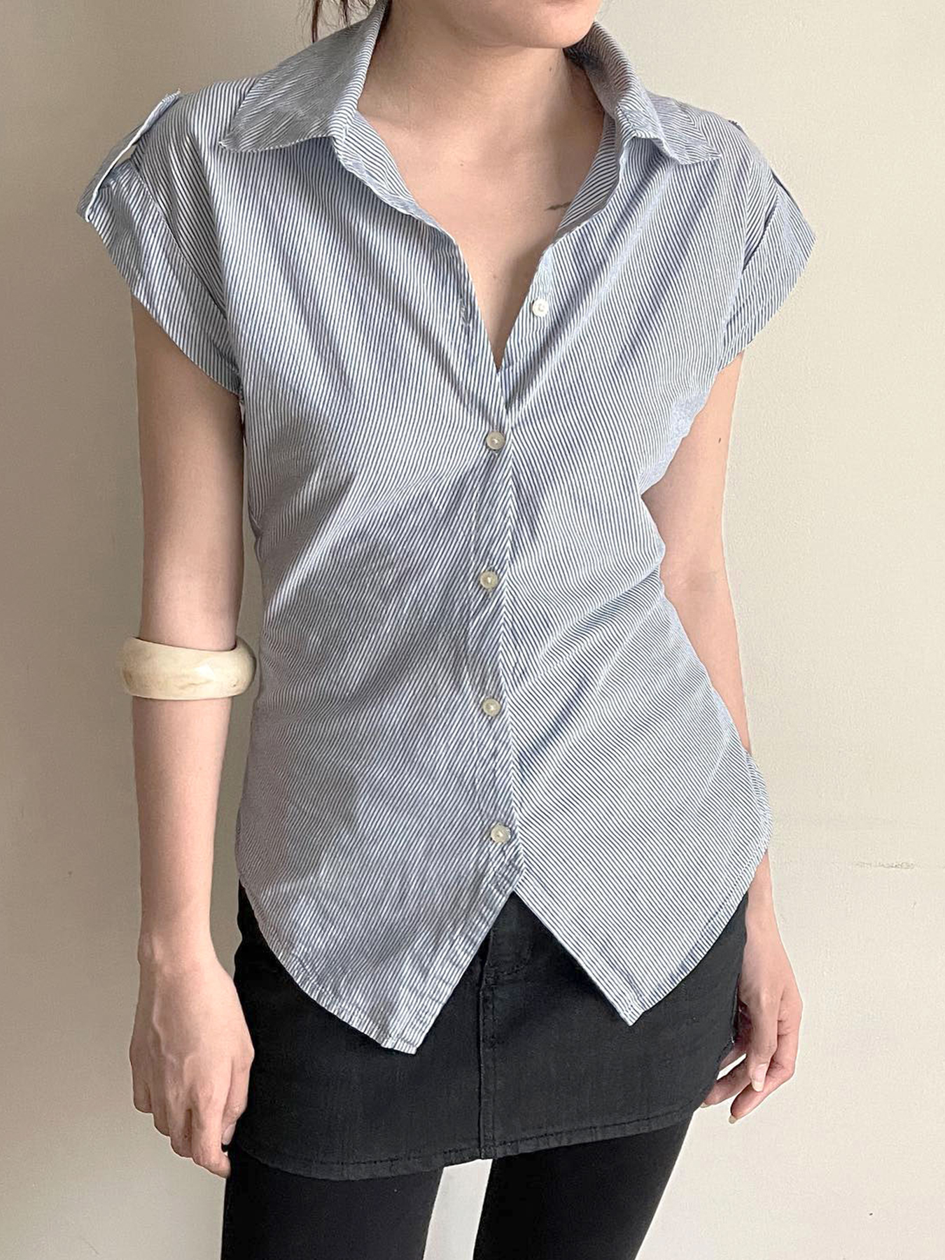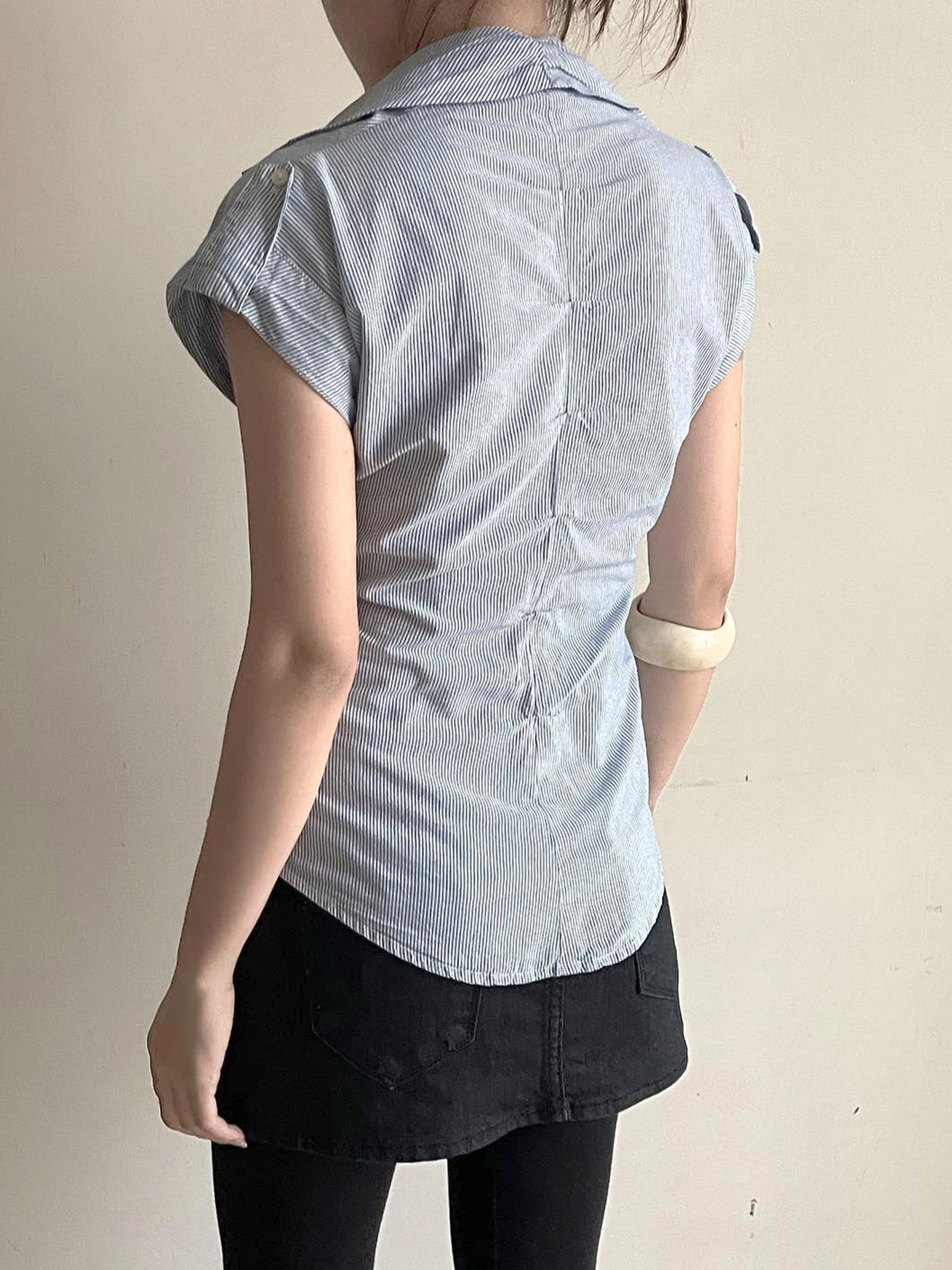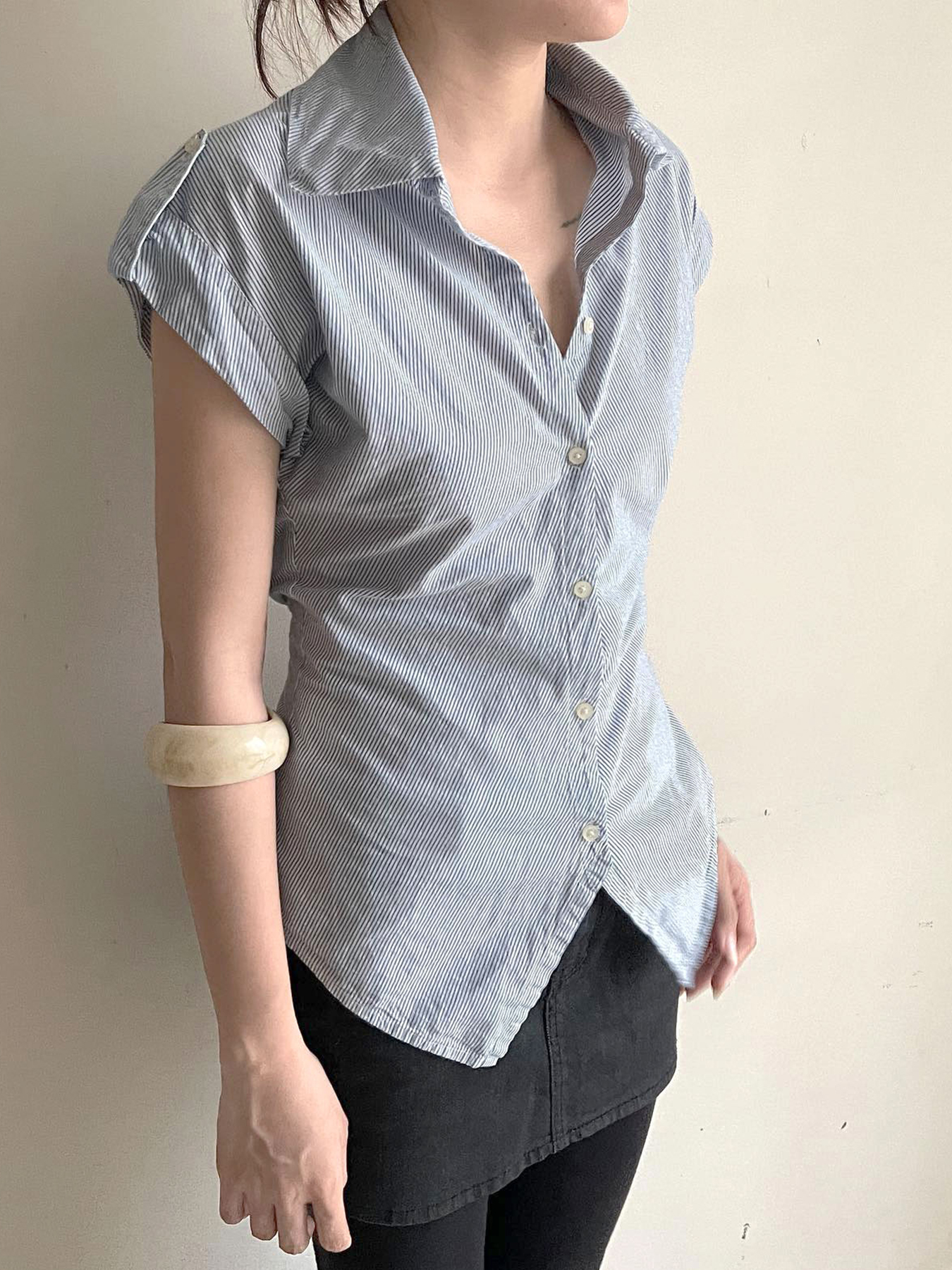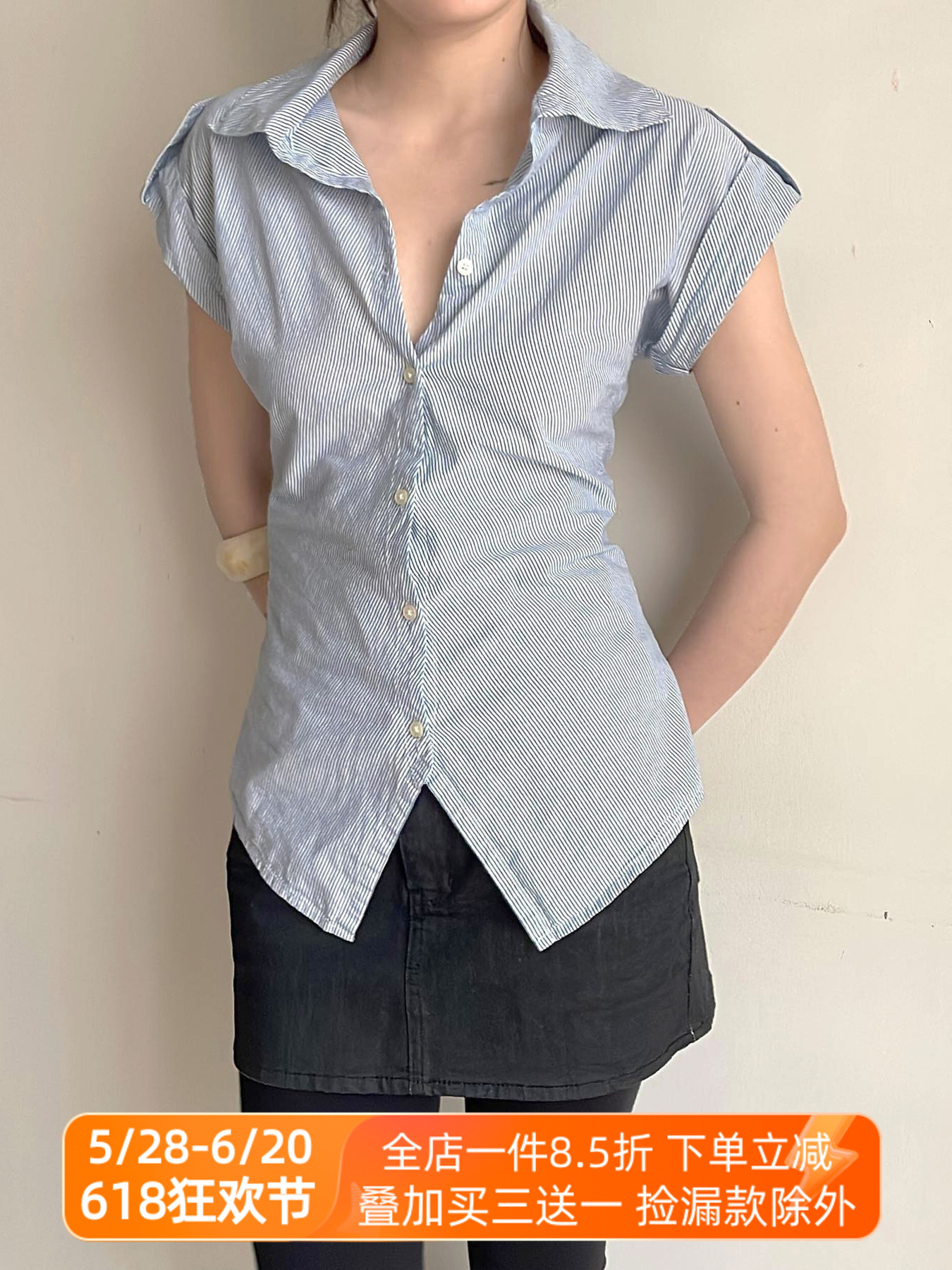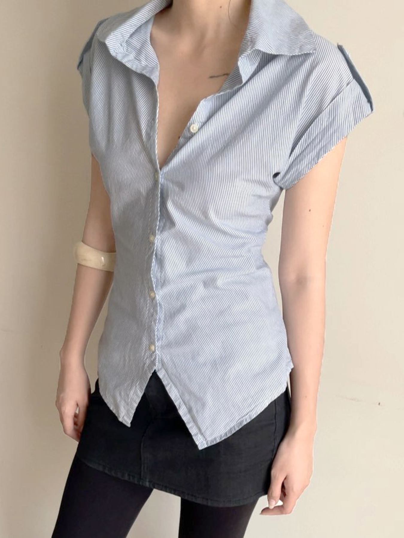 Blue Striped Short Sleeve Button Up Cardigan Shirt Women Summer WaiDefined Top High-quality product featuring prom dresses, spring outfits, business casual outfits and more. Modern design that fits the latest trends. Premium materials ensure durability and comfort. Order now for special offers! Product designed with attention to every detail. Suitable for all occasions and personal styles.