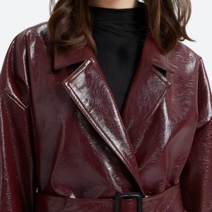 The Burgundy Faux Leather Coat adds bold sophistication to your wardrobe. Its rich burgundy color and longline silhouette offer warmth and elegance, making it perfect for pairing with both tailored trousers and casual denim.