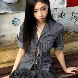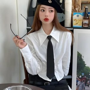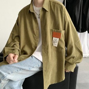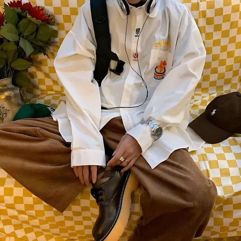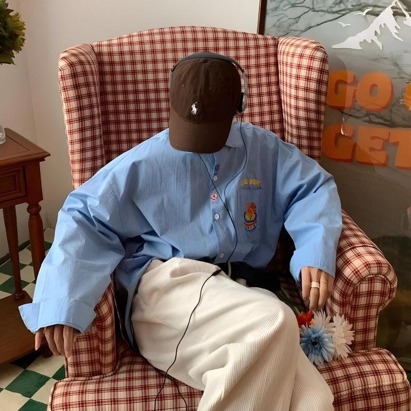 The oversized fit offers comfort and a relaxed style, while the charming bear embroidery on the pocket adds a unique and fun detail. Perfect for casual outings or adding a touch of personality to your everyday look, this shirt pairs well with jeans, skirts, or corduroy pants for a versatile and cute ensemble. Embrace a bit of whimsy with this delightful embroidered shirt.