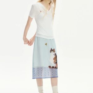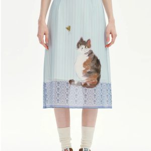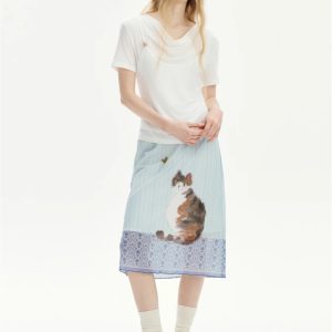 The Cat Print Midi Skirt adds a whimsical charm to any outfit. Designed with a soft pastel base and an artistic cat motif, it blends playful detail with elegant simplicity. The lightweight fabric drapes beautifully, while the mid-length cut offers easy movement. Perfect for pairing with basic tops or knitwear for a soft, aesthetic look.