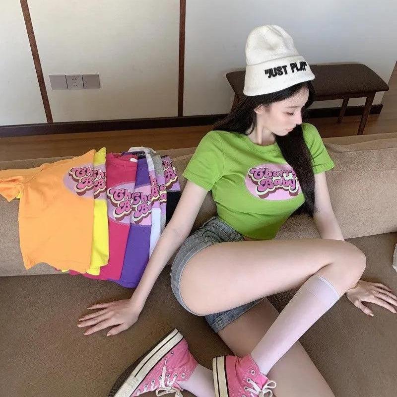 Spice up your wardrobe with this colorful graphic Cherry Baby Crop Top. Its polyester, slim-fitting design with short sleeves is a playful addition to any trendy outfit. Perfect for those who love a touch of whimsy.