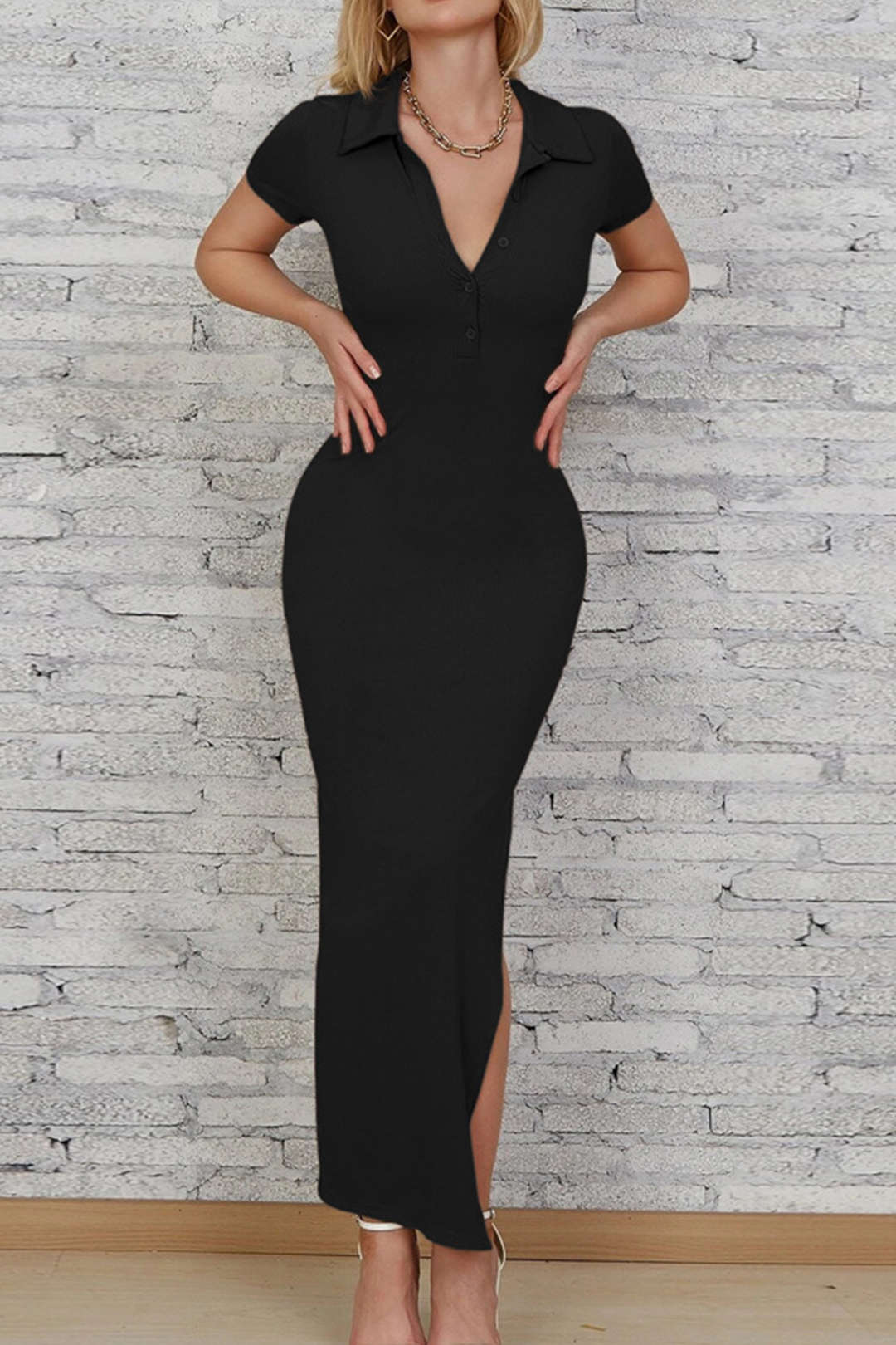 Solid Ribbed Collared Short Sleeve Button Down Slit Maxi Dress Y2K High-quality product featuring prom dresses, spring outfits, business casual outfits and more. Modern design that fits the latest trends. Premium materials ensure durability and comfort. Order now for special offers! Product designed with attention to every detail. Suitable for all occasions and personal styles.