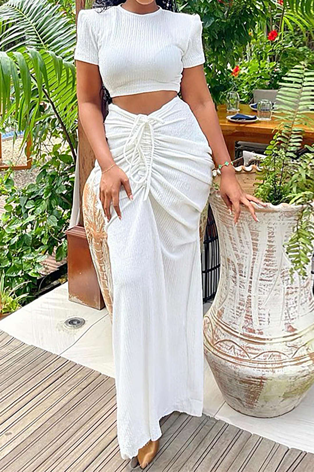 Solid Crop T- shirt Ruched Drawstring Split Maxi Skirt Set y2k outfits High-quality product featuring prom dresses, spring outfits, business casual outfits and more. Modern design that fits the latest trends. Premium materials ensure durability and comfort. Order now for special offers! Product designed with attention to every detail. Suitable for all occasions and personal styles.
