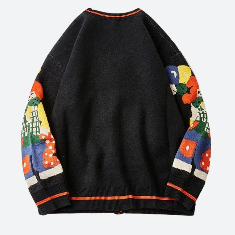 Add a quirky and playful touch to your wardrobe with this Clowns Knitted Cardigan. The bold design is contrasted with a black base and bright pops of color, creating a cheerful and eclectic look. The oversized fit makes it comfortable for layering, while the button-up front offers versatile styling options.