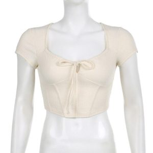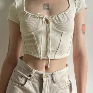 Capture the essence of romantic allure with this beige, coquette aesthetic corset. The distinctive square neckline and bust tie fastening are nods to vintage charm. Match this corset with a flowing maxi skirt to enhance its feminine appeal.