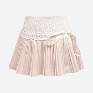 The intricate lace detailing at the waist is beautifully complemented by the delicate pleats and a soft bow, creating a harmonious blend of textures. Ideal for both casual and dressy occasions, this skirt pairs effortlessly with a simple blouse or a cozy sweater for a look that is both stylish and timeless.