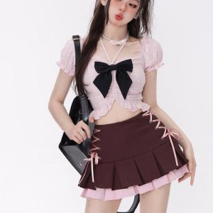 Delight in the coquette aesthetic of this charming ensemble featuring a pleated mini skirt and a cropped top. The skirt is highlighted by a tiered design with lace-up sides, all rendered in a blend of cotton and polyester for comfort and durability. The mid-rise fit further enhances its allure. Complementing the skirt is the halter neck crop top, adorned with ribbon details, and styled with short sleeves. The top features a ruffled design, adding a dash of whimsy to your look. This product is manufactured slightly smaller than usual, hence, a quick look at the size chart before ordering would ensure a perfect fit.