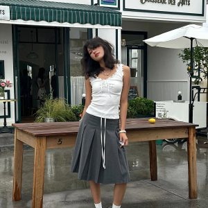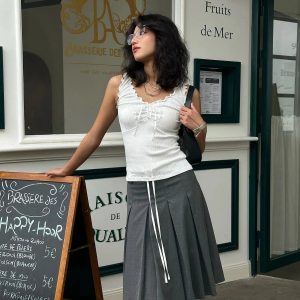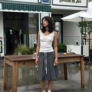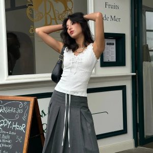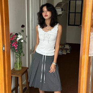 Ruffled edges and a tie-up front meet soft, stretch-kissed texture for a top that blends girly charm with casual flair. Fitted to flatter and easy to pair with low-rise skirts or wide-leg jeans, it’s a go-to look for café dates, gallery strolls, or snapping pics with a soft-grunge filter.