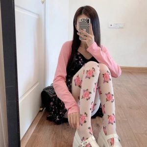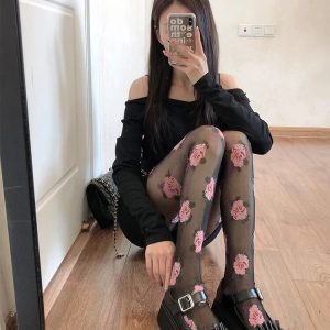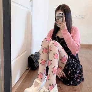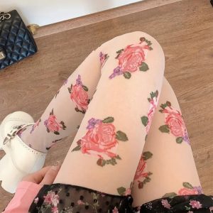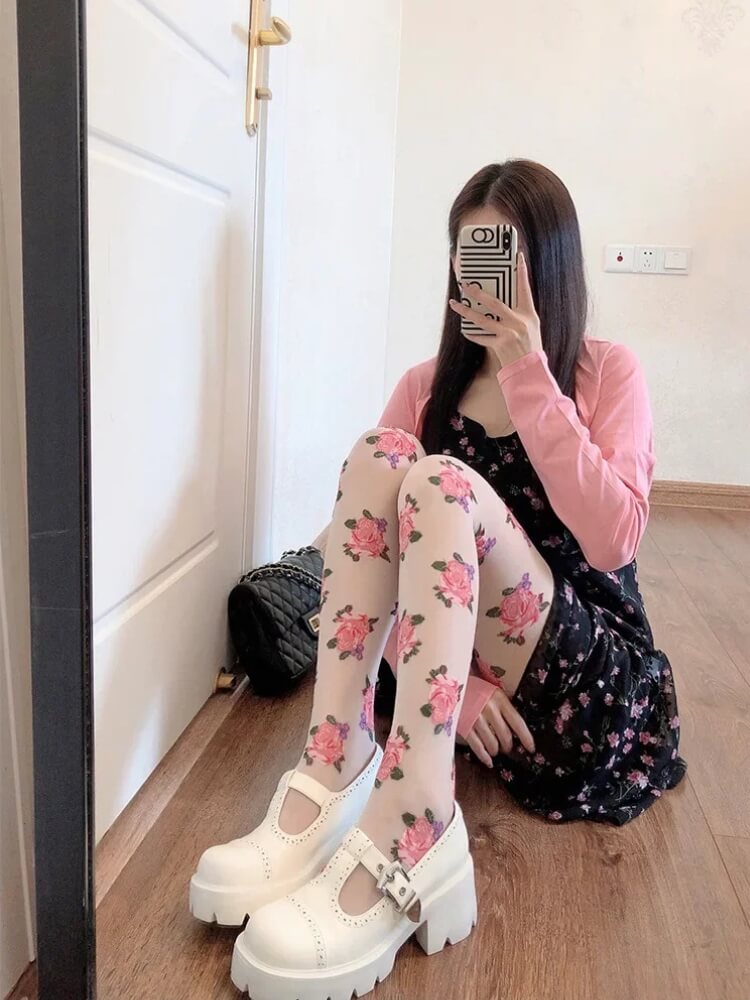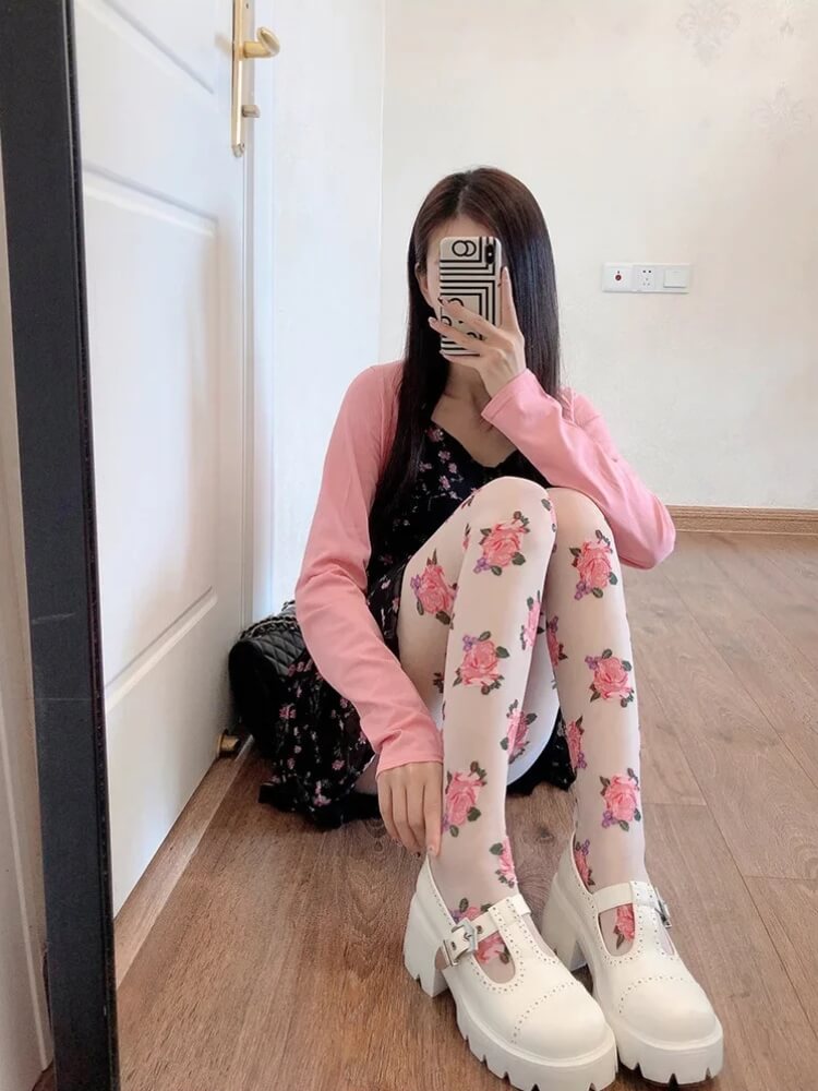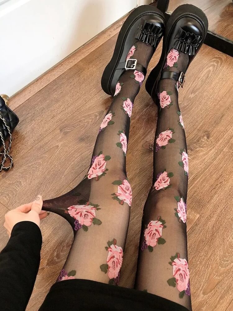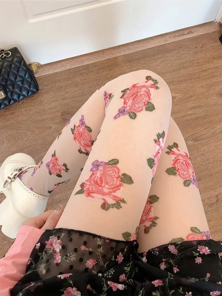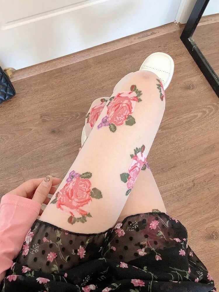 Cottagecore Rose Sheer Tights are crafted from lightweight, semi-transparent fabric with detailed rose motifs printed across the surface. The stretch construction follows the natural shape of the legs while maintaining flexibility. An elastic waistband provides secure support without tight pressure. The smooth finish keeps the floral pattern evenly distributed for consistent coverage and comfort.