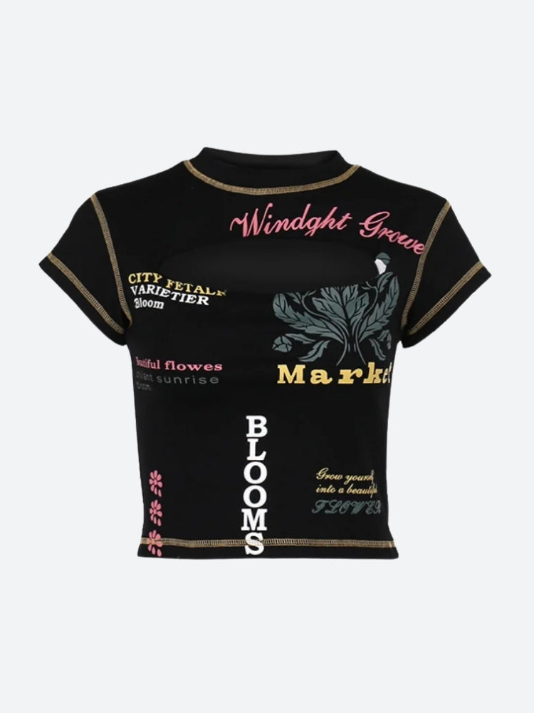 Turn heads in this bold baby tee designed with street edge and playful cutouts. Featuring a graphic ‘Market Blooms’ print and a flattering cropped fit, it’s your go-to for nights out or festival looks.