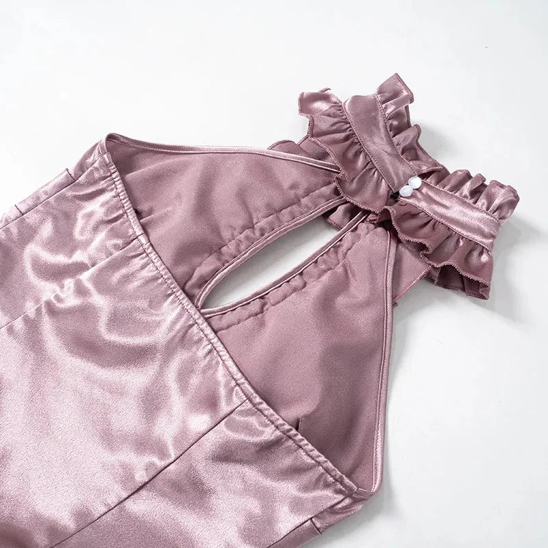 All eyes on you in this dreamy halter top. Crafted with a metallic sheen, front keyhole cutout, and cascading ruffles, it’s giving major romantic drama with a Y2K twist.