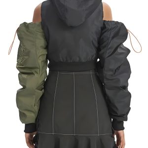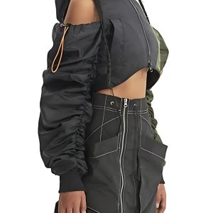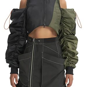 This cyberpunk aesthetic puffer jacket boasts a cropped design with adjustable ties at the shoulder and neck. The zip pocket on the sleeve and double front pockets add functionality, while the double zip fastening and off-shoulder style make it a standout choice for parties, festivals, or a cool street look.
