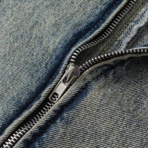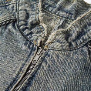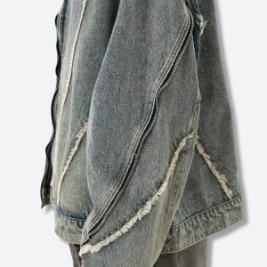 This Cyberpunk Zip-Up Denim Jacket offers a bold, industrial look with exposed seams and distressed detailing. Its oversized fit pairs perfectly with cargo pants or ripped jeans for versatile streetwear style.