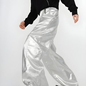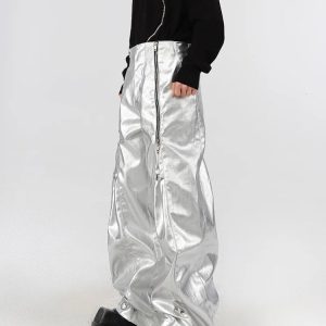 Give your streetwear a futuristic spin with these cyberpunk zip-up parachute pants. Their metallic finish and adjustable zippers stand out for edgy style. Ideal for concerts or daily looks.