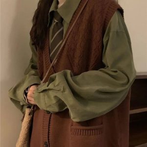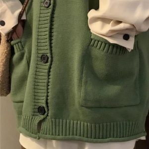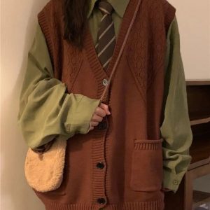 Embrace the scholarly charm of dark academia with this sleeveless cardigan. Its deep V-neckline and soft knit material make it a comfortable yet stylish choice. Featuring two front pockets and unique round details, it’s ideal for layering in the fall for a cozy, intellectual look.