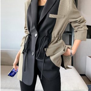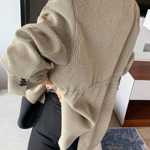 This unique blazer perfectly encapsulates the dark Academia aesthetic with its striking light brown and black design. The cotton-polyester blend, lapel collar, double button, and tie fastening evoke intellectual sophistication. Its elasticated waist and various pockets amplify its practical appeal. Ideal for scholarly pursuits or a refined gathering.