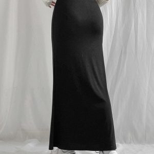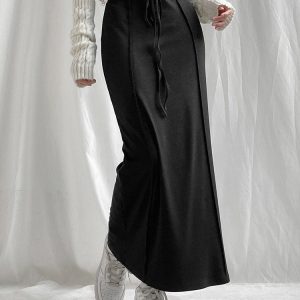 Discover the allure of the dark academia aesthetic with this high-waisted, black maxi skirt. Sporting an elasticated and drawstring waist, it blends comfort with scholarly charm. Crafted from a stretchy polyester-spandex mix, it’s the ideal pick for a sophisticated yet daring style statement.