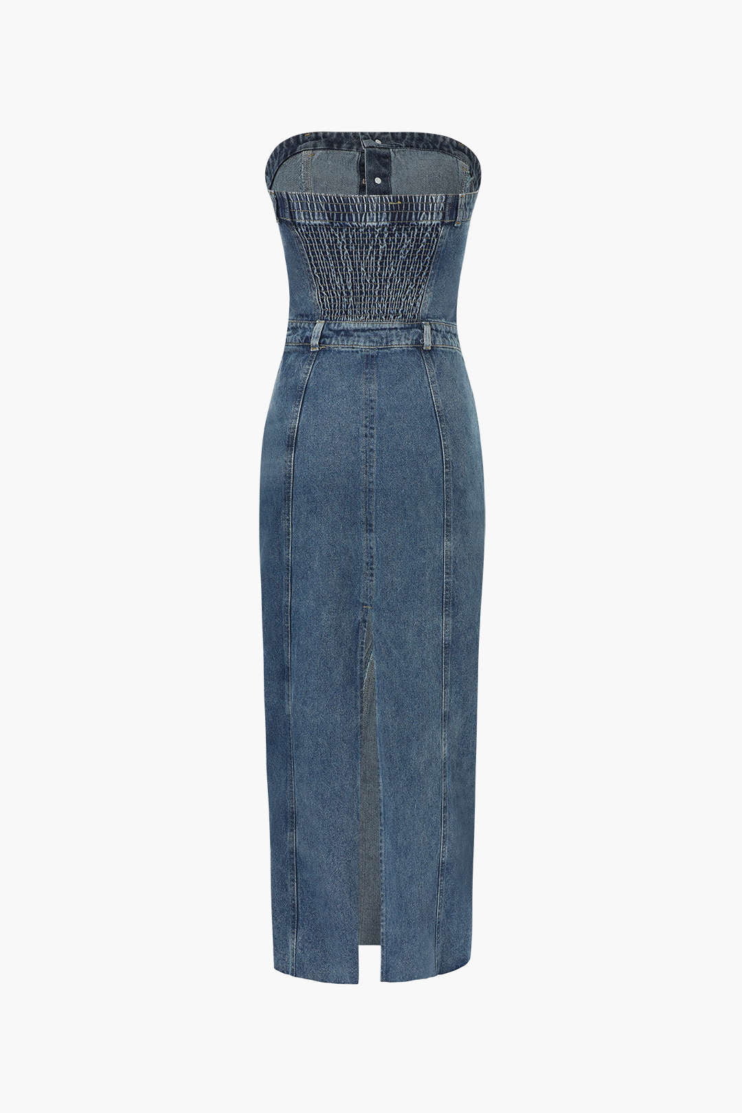 Denim Strapless Midi Dress Back Slit Y2K High-quality product featuring prom dresses, spring outfits, business casual outfits and more. Modern design that fits the latest trends. Premium materials ensure durability and comfort. Order now for special offers! Product designed with attention to every detail. Suitable for all occasions and personal styles.
