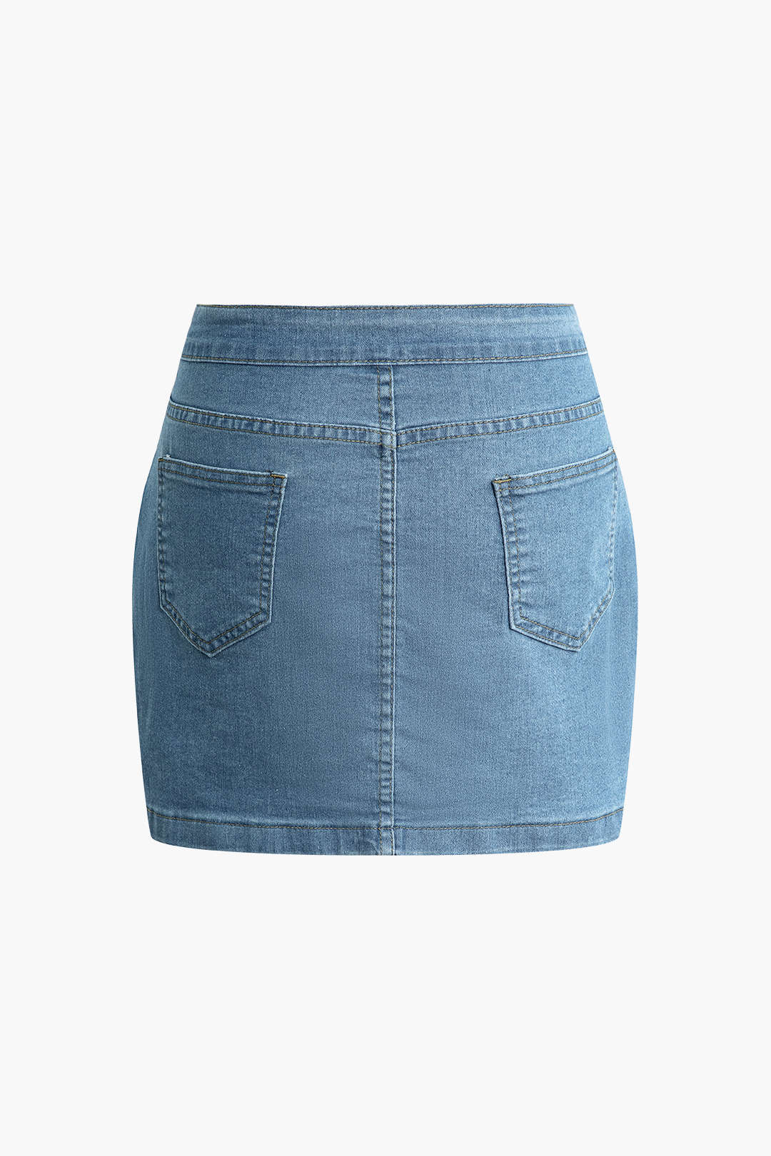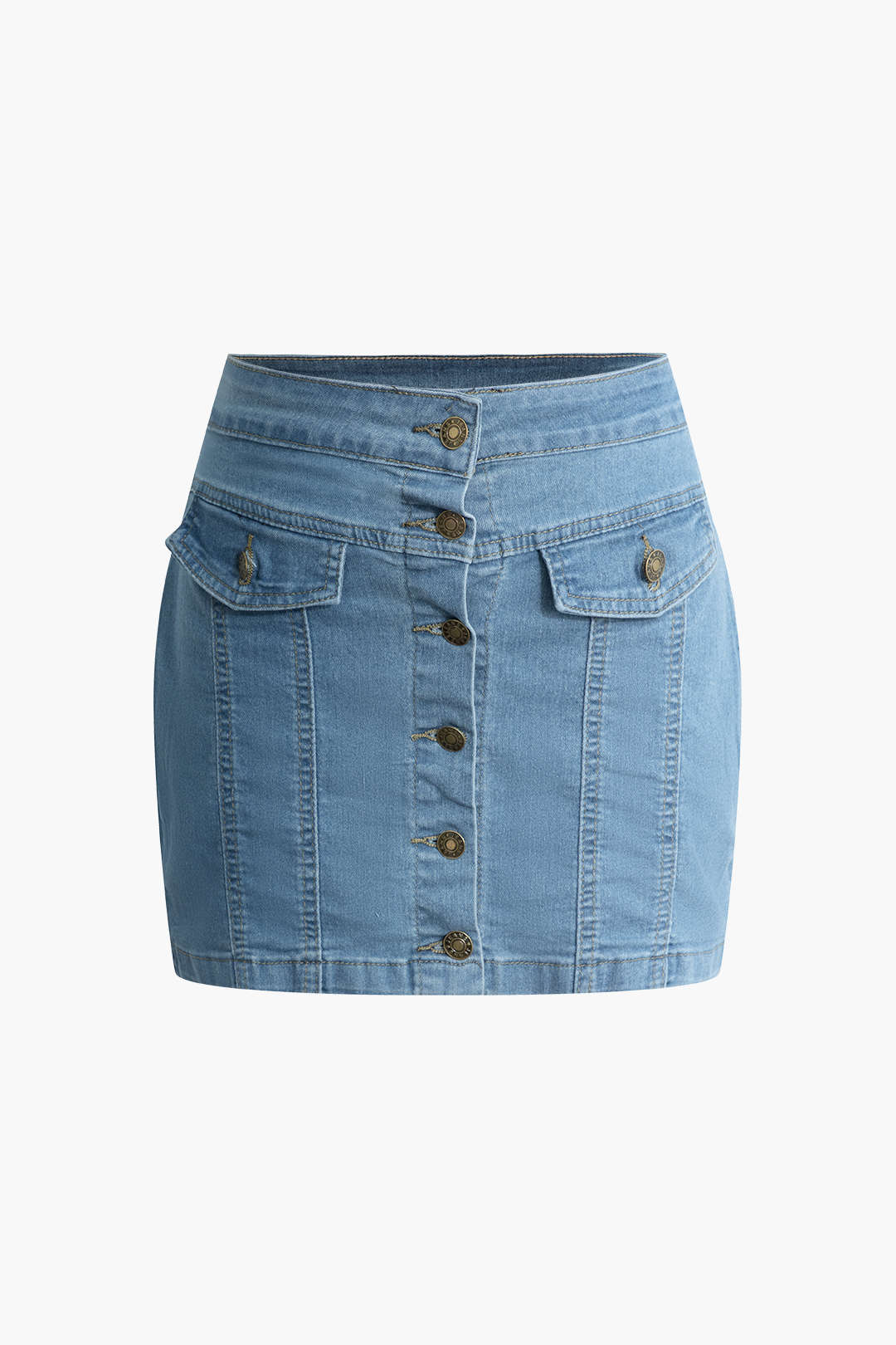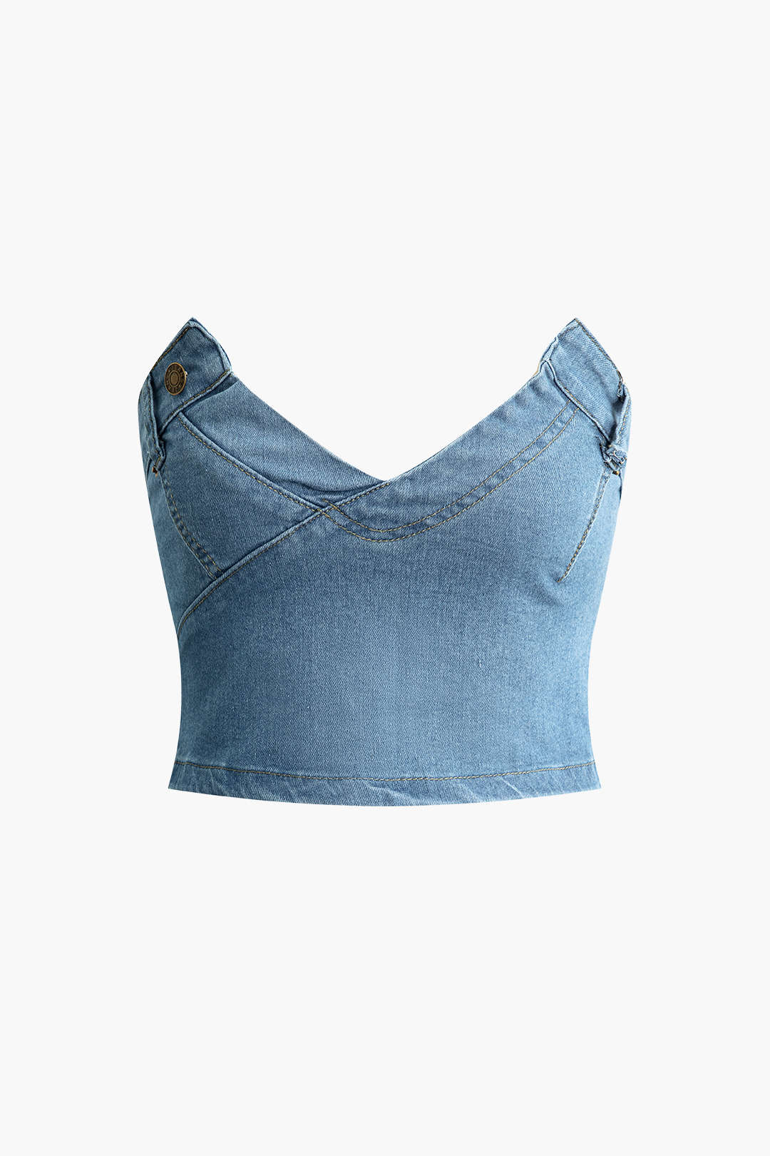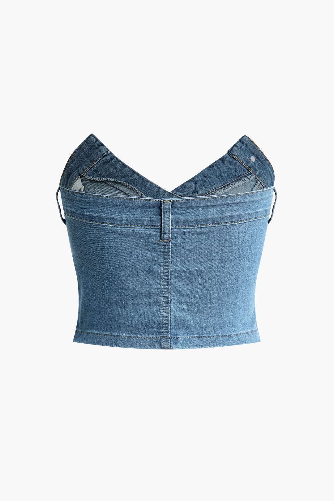 Denim V- Neck Strapless Top Button Up Mini Skirt Set y2k outfits High-quality product featuring prom dresses, spring outfits, business casual outfits and more. Modern design that fits the latest trends. Premium materials ensure durability and comfort. Order now for special offers! Product designed with attention to every detail. Suitable for all occasions and personal styles.
