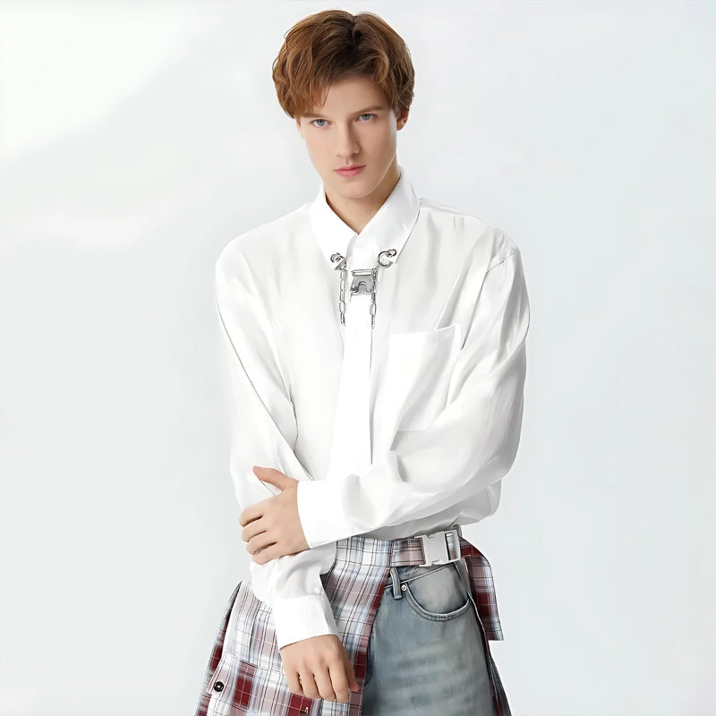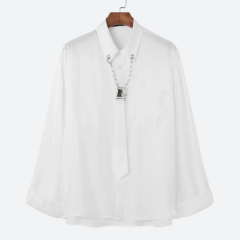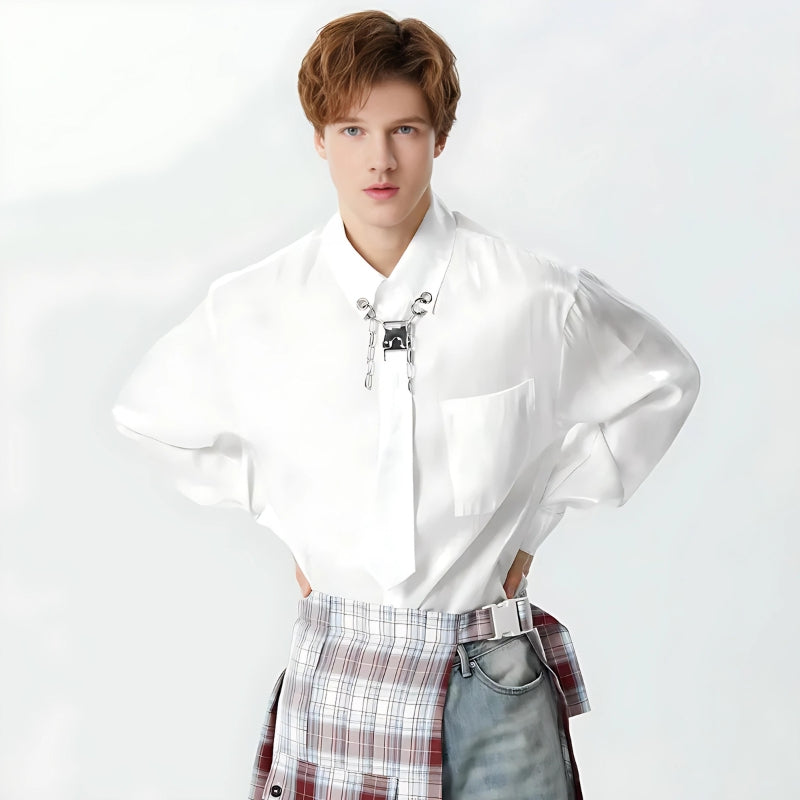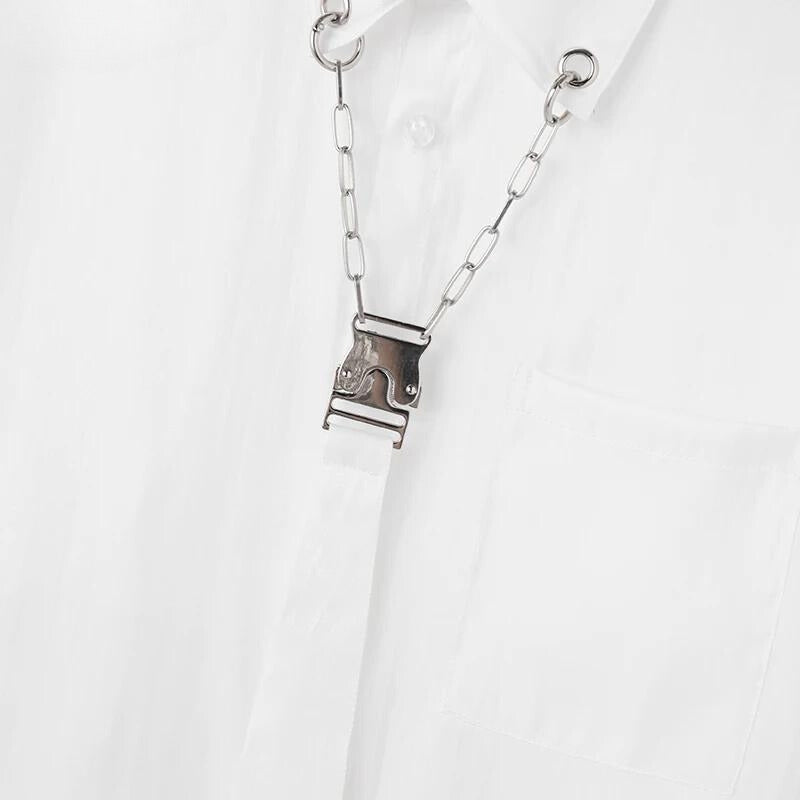 This top is a statement piece with its detachable tie detail, blending a touch of edginess into the classic white shirt. Ideal for those who appreciate a versatile wardrobe item, it’s a subtle yet striking choice for any occasion.