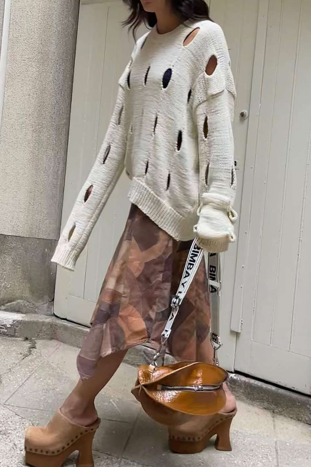 Step into the world of Y2K fashion with our Distressed Cut Out Round Neck Long Sleeve Knit Top, a must-have for any fashion-forward wardrobe. This top embodies the essence of 90s outfits and grunge outfits, making it the perfect addition to your Y2K summer outfits collection. The unique distressed design and cut-out details give it a playful yet edgy vibe, ideal for those who love to stand out.
