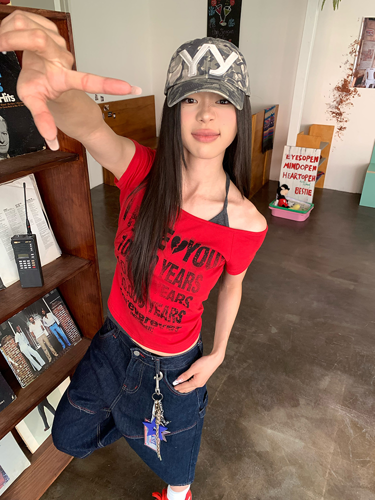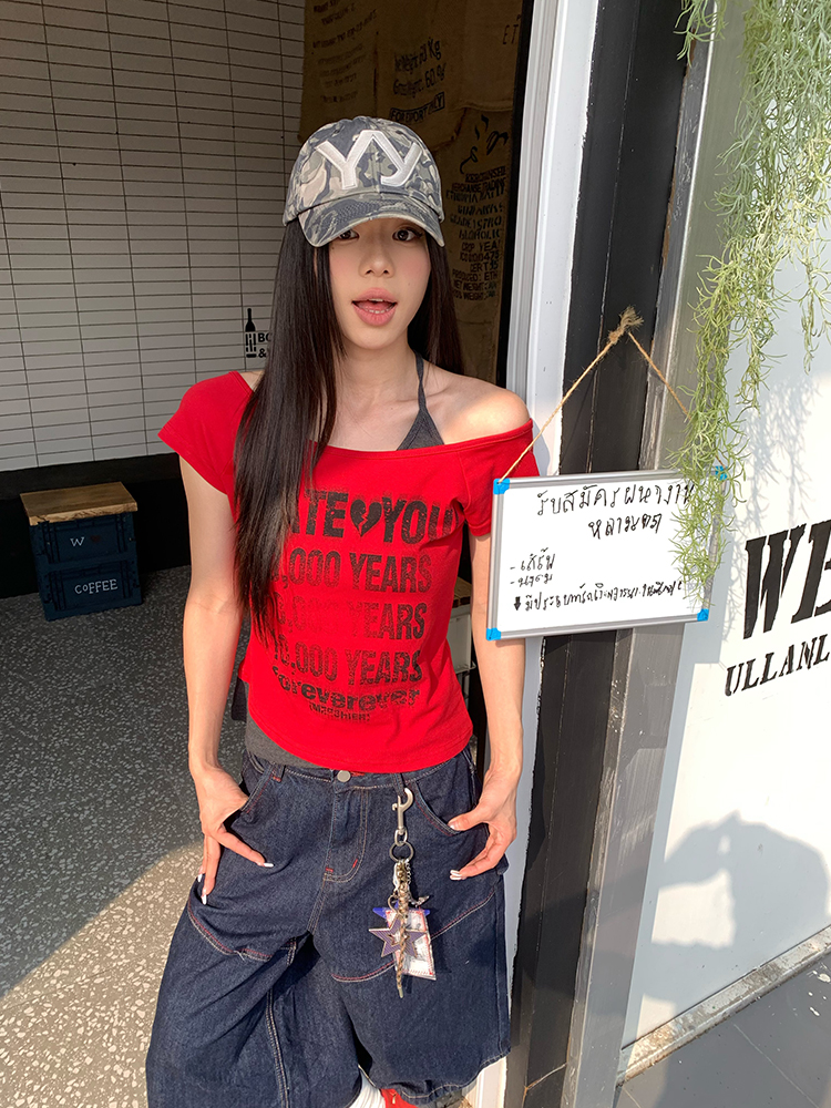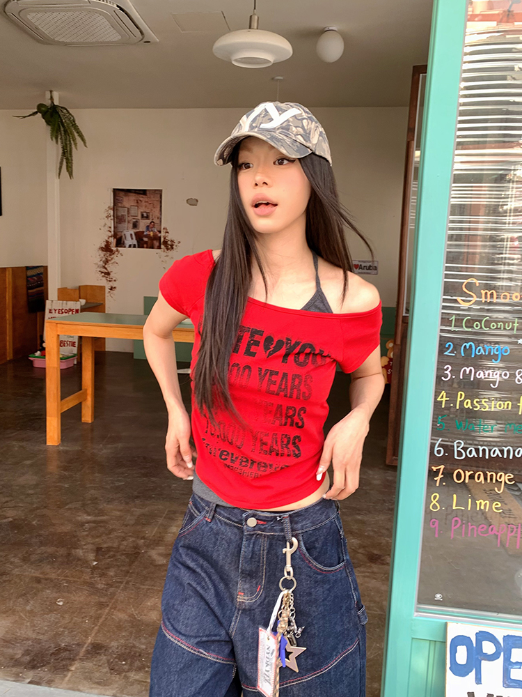 Letter Off Shoulder Halter Two Summer T- shirt Slim Fit Women Short Sleeve Top pired High-quality product featuring prom dresses, spring outfits, business casual outfits and more. Modern design that fits the latest trends. Premium materials ensure durability and comfort. Order now for special offers! Product designed with attention to every detail. Suitable for all occasions and personal styles.