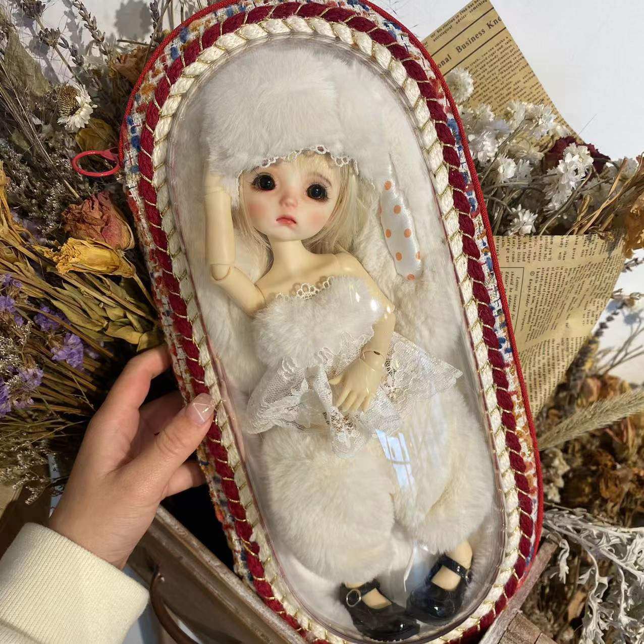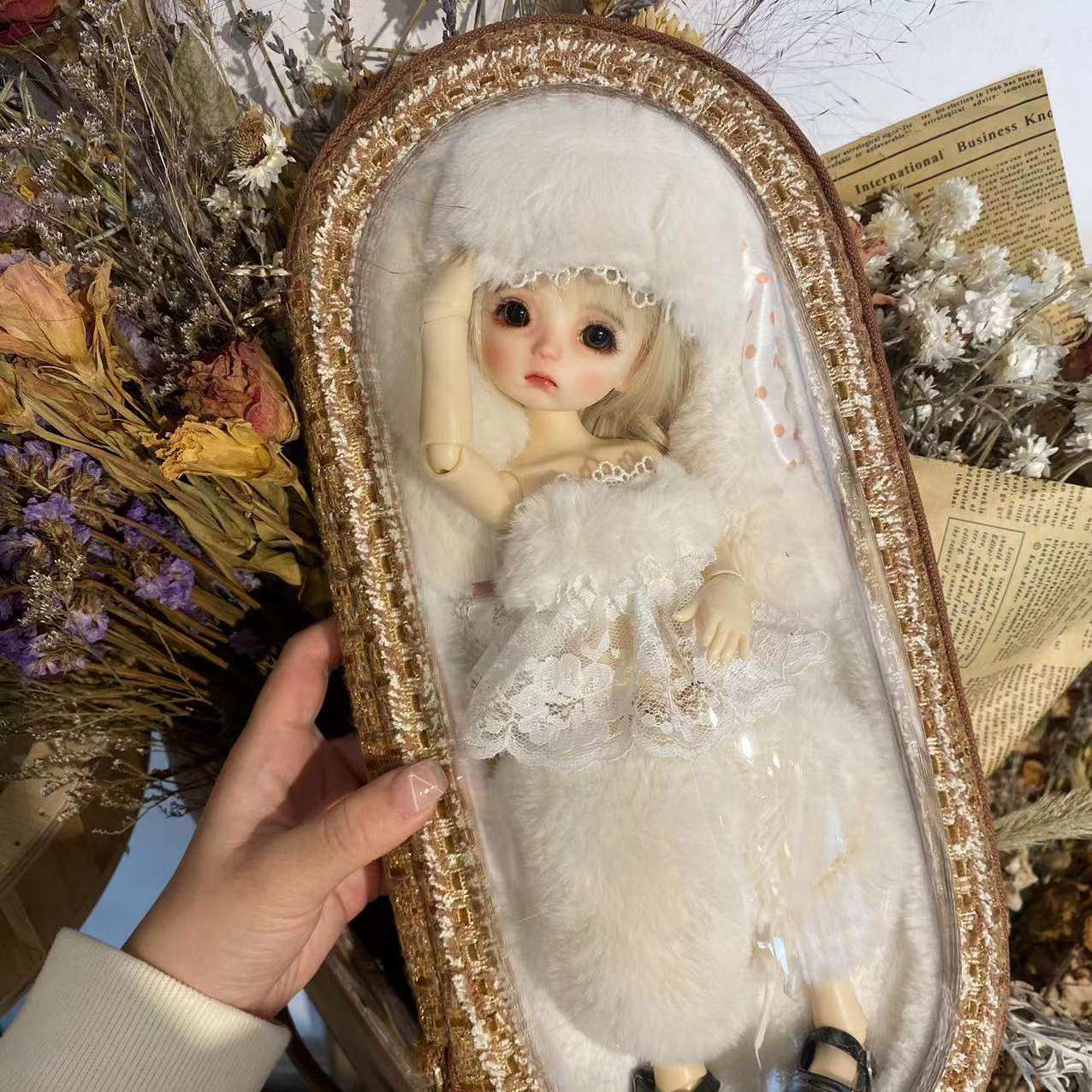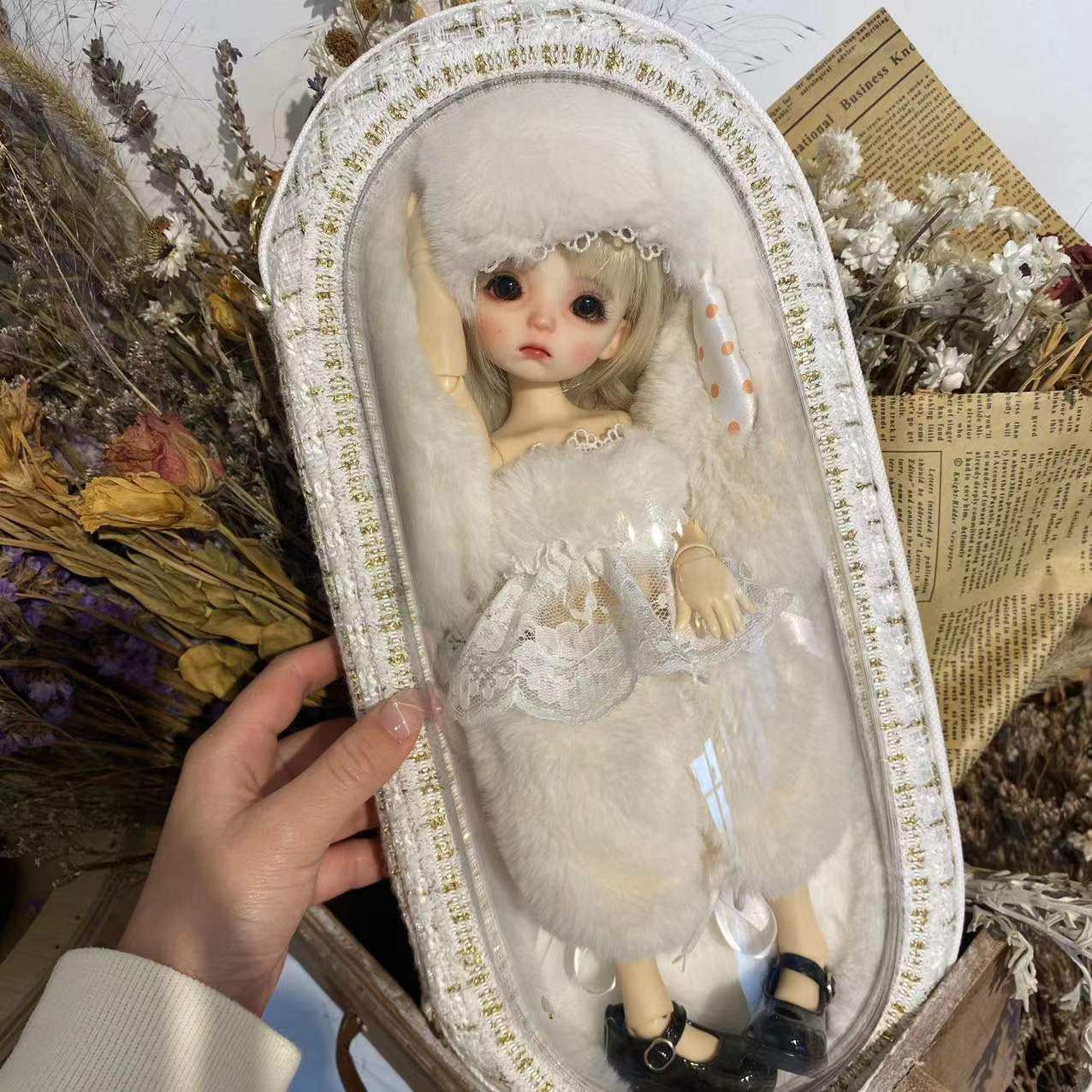 Rabbit fur is filled within the crier to protect the doll.