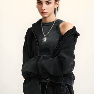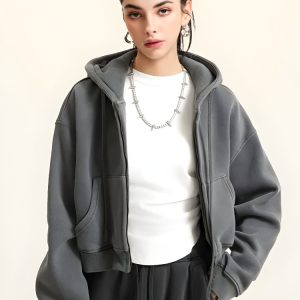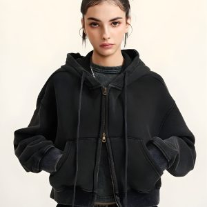 This cropped hoodie combines comfort with style, featuring soft touch material, a drawstring hood, and a unique double zip front. Twin front pockets add functionality, making it a cozy and versatile addition to any casual or streetwear outfit. Its soft girl aesthetic makes it a winter wardrobe staple.