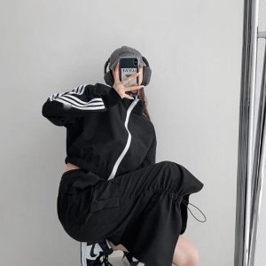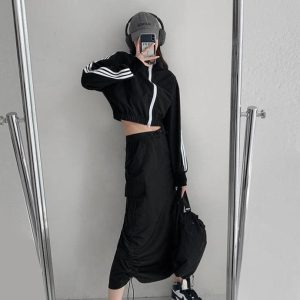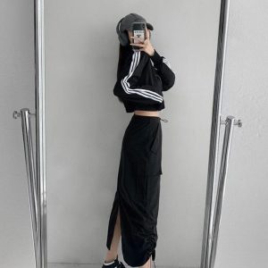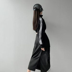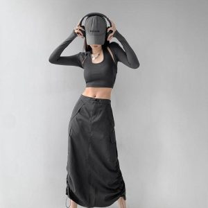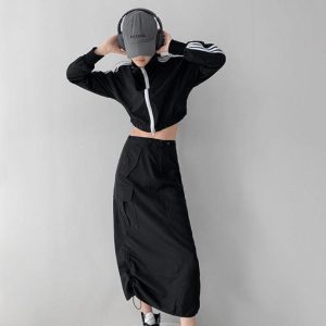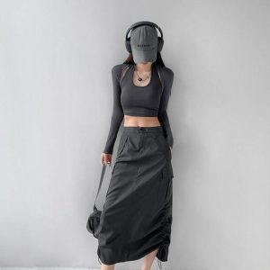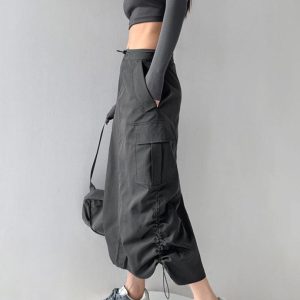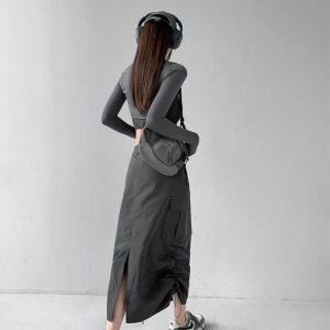 This midi skirt is a standout piece with a distinctive cargo and parachute style. The tech-colored garment has an adjustable drawstring at the waist and hem, offering a customizable fit. It features four pockets, proving utility can be fashionable. Its high waist, back slit, and polyester construction combine comfort with a high-tech aesthetic.