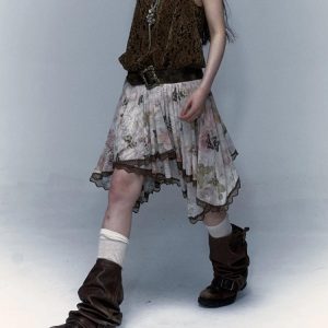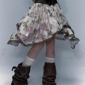 With a whimsical floral pattern and charming asymmetrical hemline, this skirt adds magic to your wardrobe. The vintage-inspired belt enhances its fairy grunge aesthetic. Pair with lace tops or chunky boots for a standout look on any occasion.