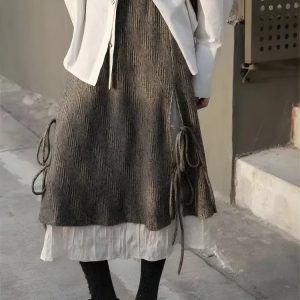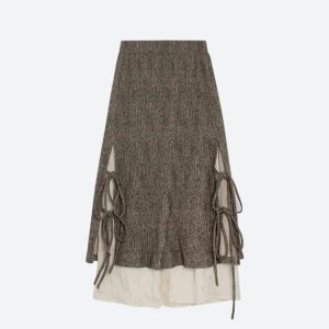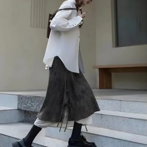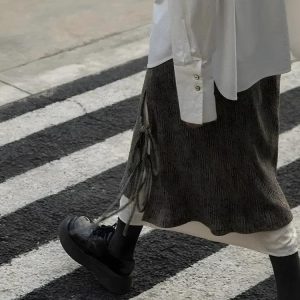 This A-line midi skirt captures the essence of fairy grunge with its lace-up details and cream lining. Its enchanting aesthetic makes it a versatile piece for casual outings, cozy gatherings, or streetwear looks in the fall. A charming addition to any wardrobe.