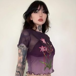 This sheer top features a beautiful lily print that adds a touch of whimsy to your wardrobe. Perfect for layering or wearing on its own, it effortlessly combines feminine elegance with a hint of edgy style. The soft, breathable material ensures comfort while the intricate details make it a standout piece for any occasion.